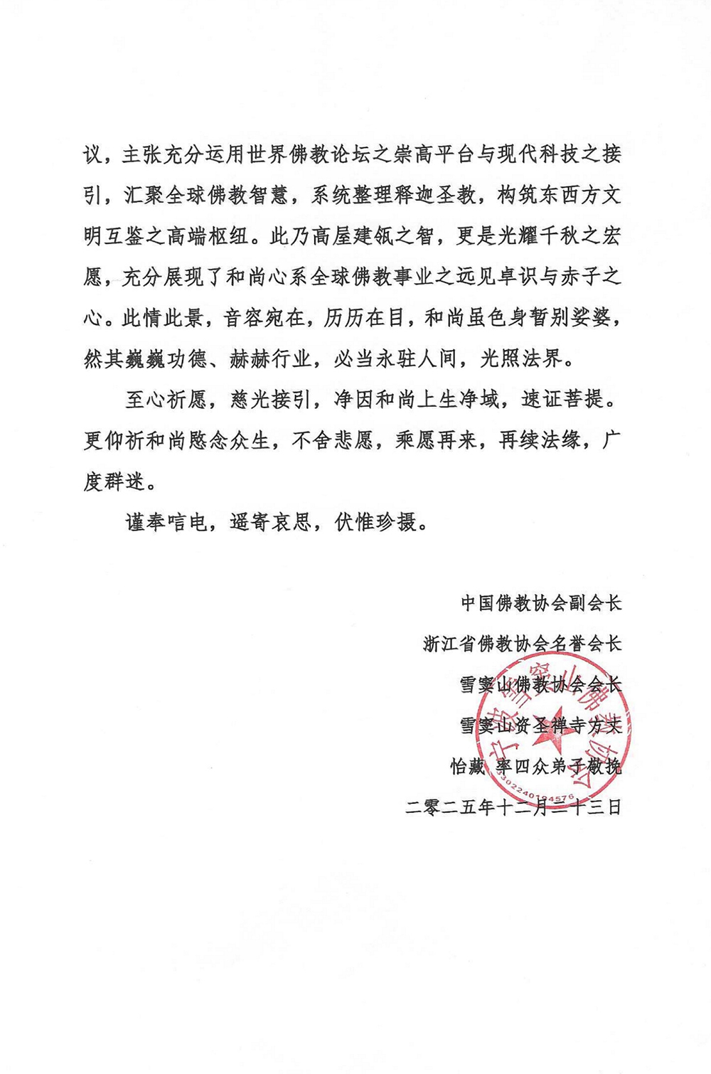 宁波雪窦山佛教协会会长怡藏法师致唁电悼念净因法师