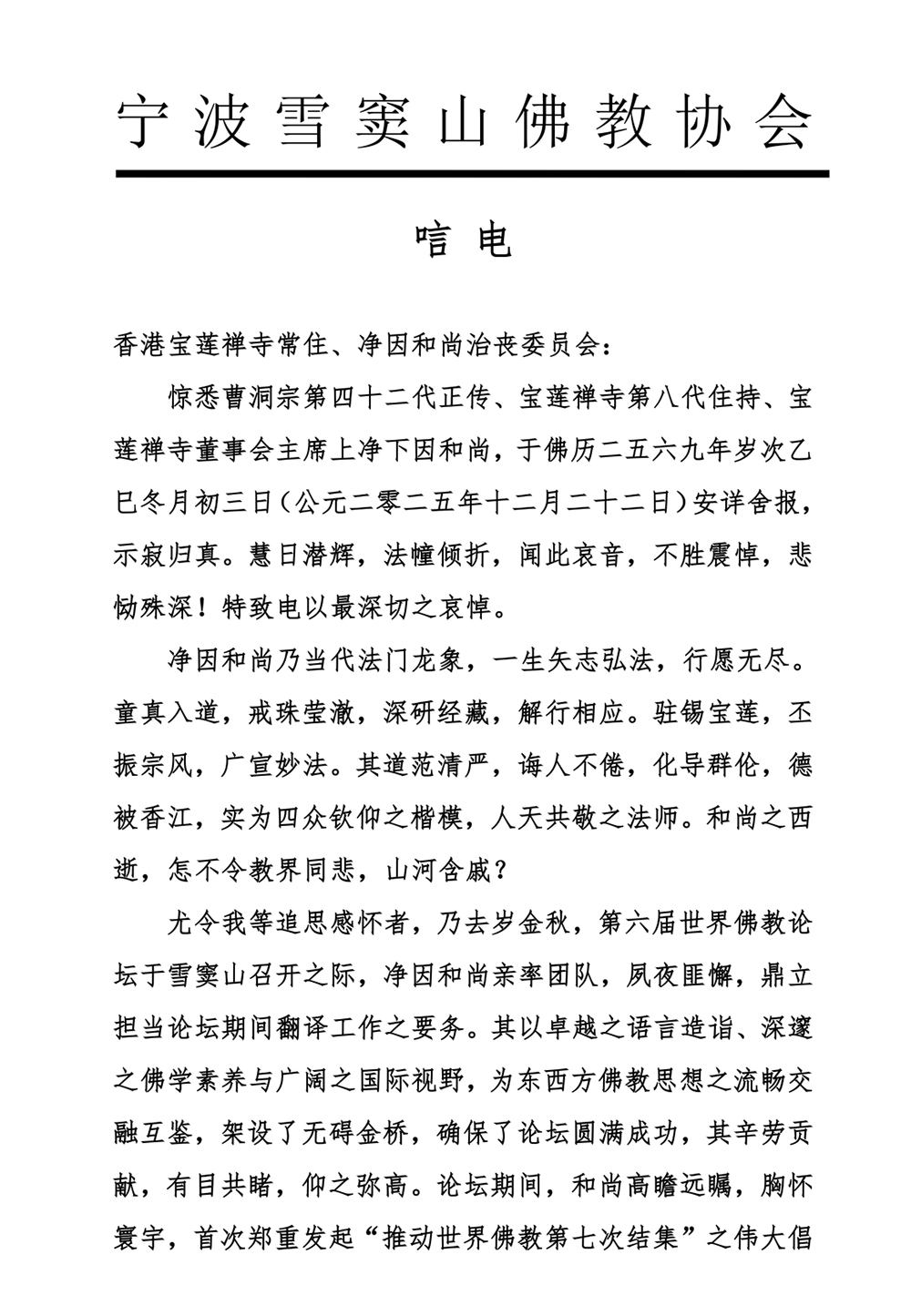 2025年12月22日(岁次乙巳年十一月初三),曹洞正宗弟四十二代传人、香港宝莲禅寺第八代住持净因法师安详示寂,世寿62岁。宁波雪窦山佛教协会会长怡藏法师知悉净因法师圆寂,特发唁电,表达对净因法师的深切哀悼。唁电如下: