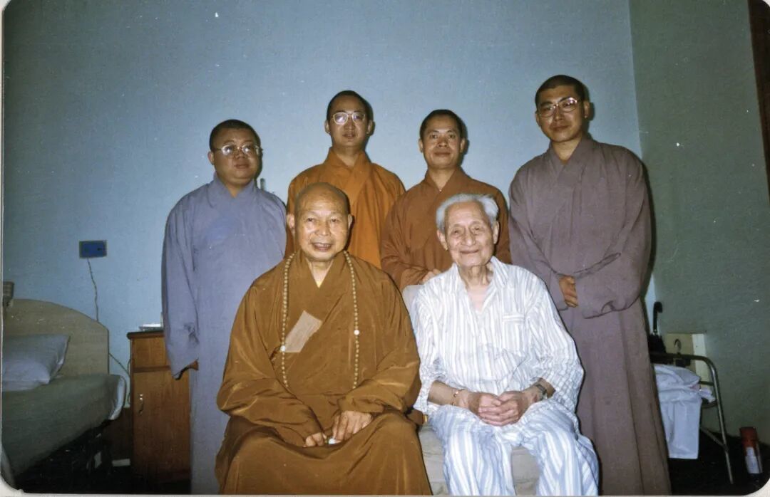 1999年在北京陪一诚长老及五比丘到医院看望赵朴老,与一诚长老、五比丘中净因、广兴、圆慈、学愚一起