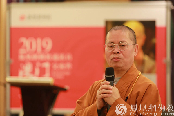2019年11月,净因法师在凤凰网佛教通讯员澳门交流营上做内容分享