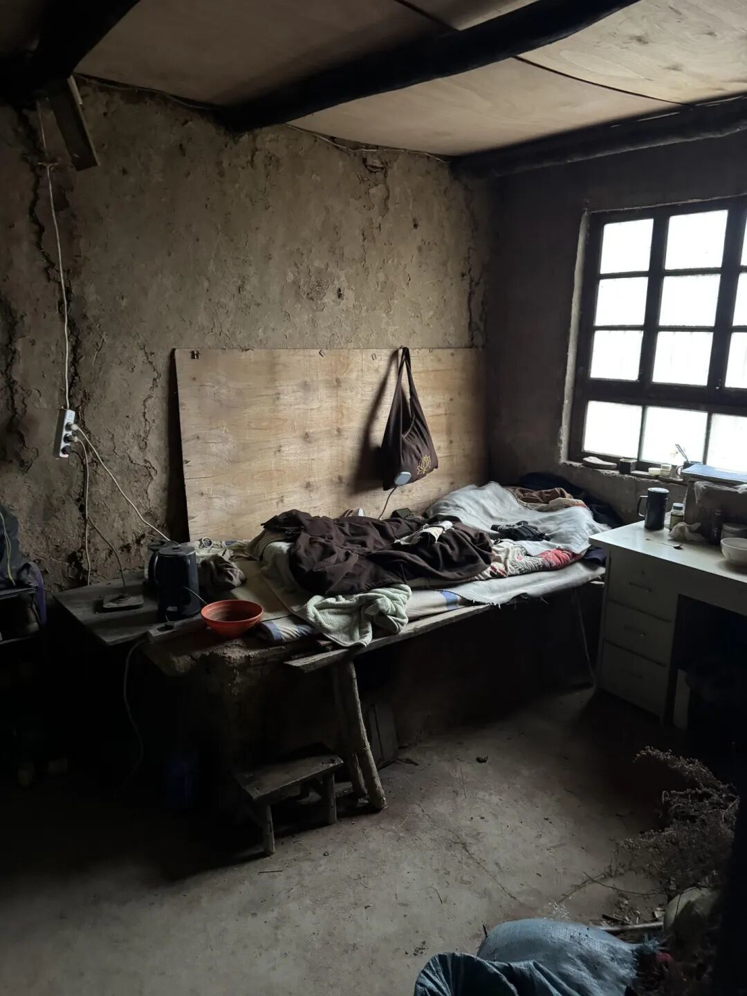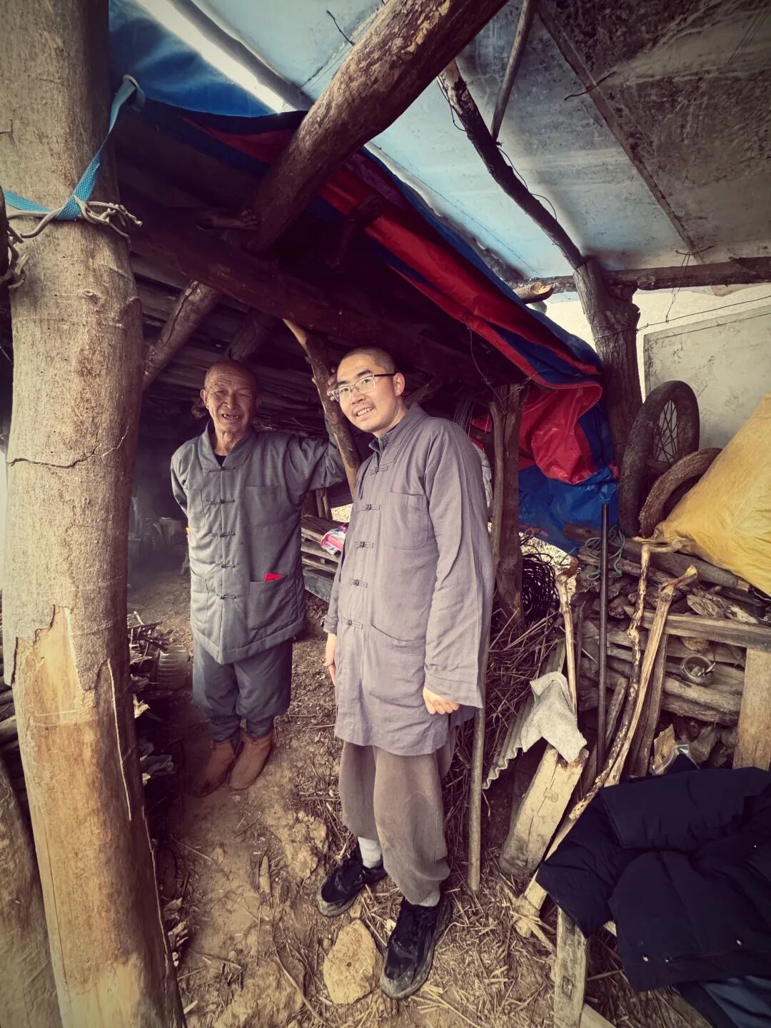 茅棚不大,一目了然:屋内一张不及单人床大的土炕,炕上搁着个三层小衣柜,更挤占了原本就局促的睡觉空间;三四本经书只能一字排开,紧贴着立放在窗沿;挨着炕边,有一方佛桌,几张佛画、三支残香、数枚供果,便是全部庄严。屋内空间仅容一人转身,屋外延展的屋檐下,有个简易仓库,囤放着一点儿简单生活物资;一个自搭的土灶,供平日烧水做饭用。整个茅棚内外朴素、整洁,恰如通顶师父其人。