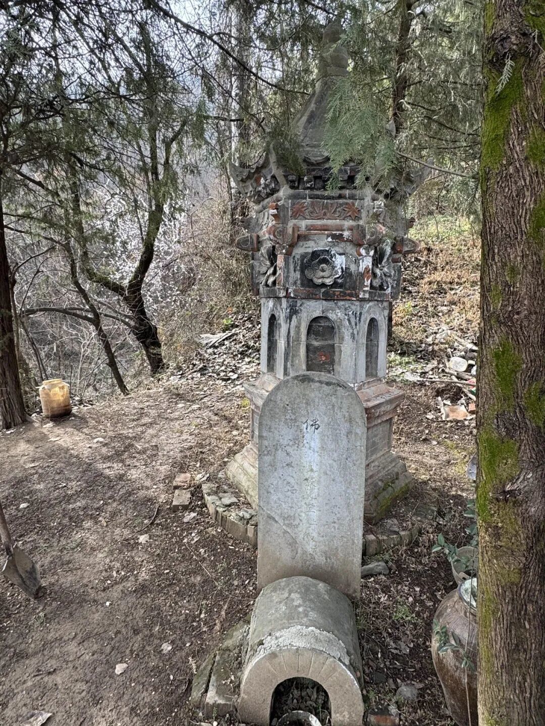 通顶师父的茅棚坐落于山脚村后,立于岔路口一边隆起的土坡上,紧邻一座约二三米高的比丘师父纪念塔。
