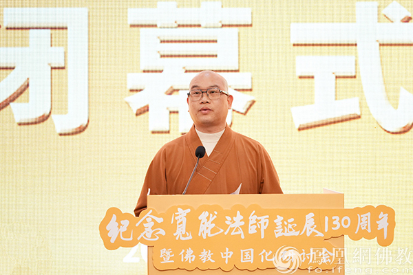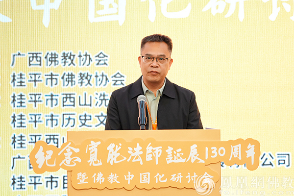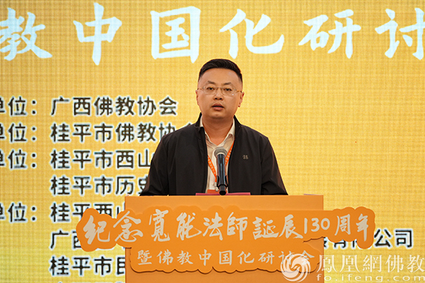 贵港市委统战部常务副部长徐旭在致辞中表示:希望各位宗教界朋友、专家学者和嘉宾畅所欲言、坦诚交流,既从历史维度梳理宽能法师的精神传承,也从现实角度探讨宗教中国化的实践路径;既总结佛教界服务社会的成功经验,也为文化繁荣、社会和谐建言献策。让我们以此次活动为契机,进一步凝聚共识、汇聚力量,推动宗教更好地与社会主义社会相适应,为加快新时代贵港现代化建设、书写壮美广西新篇章、建设中华民族共有精神家园贡献出宗教界的智慧和力量。