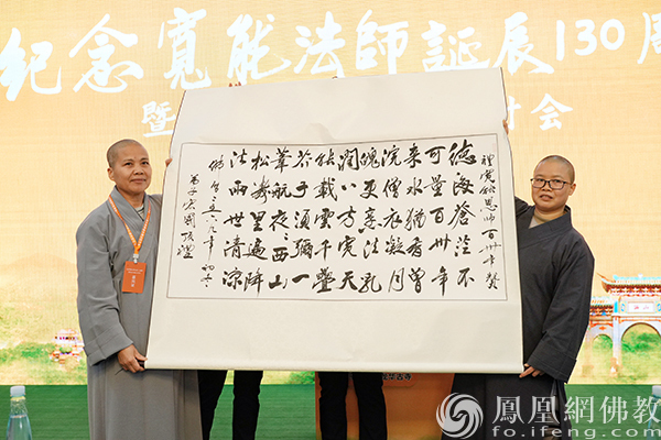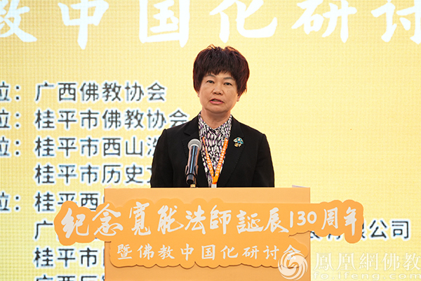 广西壮族自治区民宗委二级巡视员朱小梅在致辞中表示:我们纪念宽能法师,就是要学习和弘扬她身上所体现的宝贵精神品质,为当代佛教的健康传承注入强大的精神动力,为坚持佛教中国化广西实践提供宝贵的经验;学习她的爱国情怀,始终将个人的修行与国家的命运紧密相连,做一名坚定的爱国者。学习她的文化脉络,始终致力于佛教文化的传承与发展,积极推动佛教思想与中华优秀传统文化相融合;学习她的人才观点,始终将培养合格的佛教人才作为振兴佛教的关键。
