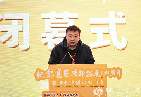 广西商业技师学院、全州湘山寺无量寿佛文化研究会特聘研究员黄柯嘉作学术总结发言,他表示:本次研讨会的学术成果丰硕喜人。研讨会上,众多知名教授、学者莅临现场,围绕宽能法师生平思想、佛教中国化的历史脉络与当代实践等关键议题发表主旨演讲、展开深入研讨,既有对历史文献的深度挖掘,也有对现实问题的理性思考,更有对未来路径的前瞻探索,为佛教中国化研究提供了丰富的学术滋养与实践启示。愿我们以此次研讨会为契机,持续深耕佛教中国化研究,传承宽能法师的崇高精神,为促进宗教与社会主义社会相适应、为推动文化繁荣与社会和谐贡献更多学术力量!