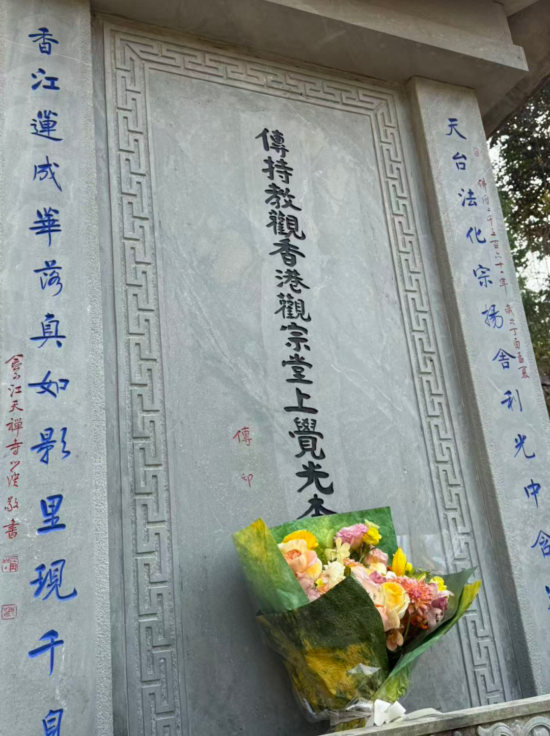 宽运法师在觉老墓碑前说:不才宽运在纪念智者大师进天台山1450年之际,专门来到长老舍利塔前拜祭:“今天只有鲜花一束,生果一碟,心香一瓣,聊表我的寸心。愿长老法身常在,慧灯常传,一直护佑香港,福佑佛联会。”